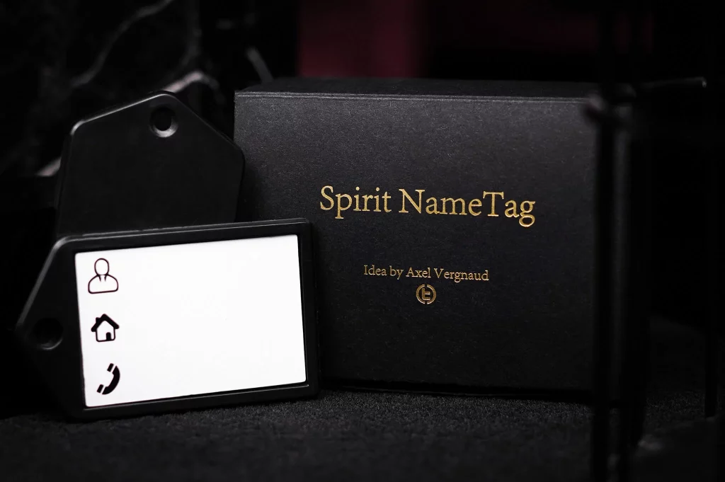 Mit dem Spirit NameTag können Sie den Spirit Slates-Effekt jetzt jederzeit und überall durchführen und sind nicht mehr auf formelle und professionelle Auftritte beschränkt. Sie entfernen zwei leere Gepäckanhänger von Ihrem Schlüsselbund, legen sie auf den Tisch und drehen sie um, um zu zeigen, was das Publikum im Sinn hat.